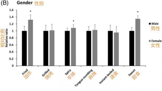 与男性相比,油炸食品和甜点在女性中更受欢迎,在女性中的比例高于男性。 33% 和 35%。女人更喜欢辛辣的食物。而且其它饮食偏好在男女之间没有明显的差别。