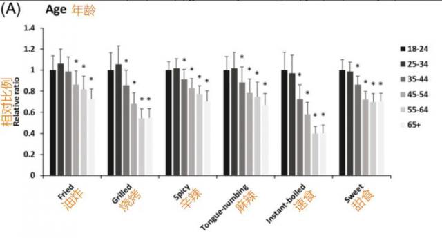 随着年龄的增长,人们会更喜欢清淡的食物。与其他口味偏好相比,老年人对火锅和烧烤的偏好大幅下降。