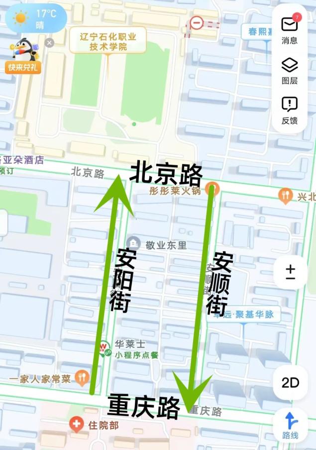 17、惠东街(南昌路至南京路)是宝地学校东墙外的道路,由南北单行。
