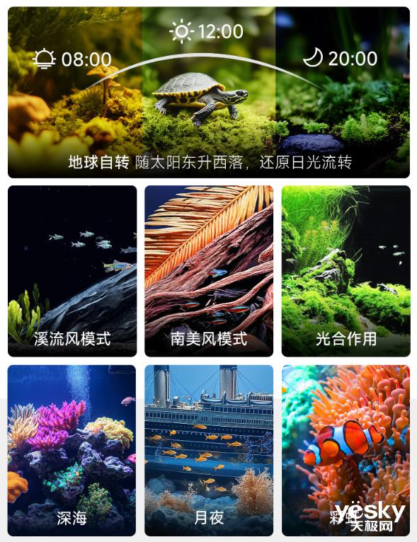 性能方面,当贝鱼缸支持自动喂食功能时,喂食器采用抽拉式设计,配有扩容桶和防潮出水口, 3 档位喂食量可供选择,加仓一次可使用半年,较贴心的一个细节就是还有喂食保护,在喂食时泵会暂停。 3 分钟 ; 在鱼缸灯方面,采用全色域万象大灯。 45 度勃朗影棚打光法,在常规欣赏时也不会感到晃眼,还有 8 选择各种照明模式和自定义模式,即南美风、溪流风、夏季、月夜、海底、地球自转。 ( 默认 ) 、彩虹,光合作用,带来更丰富的视觉效果,轻松把握气氛感这一块。