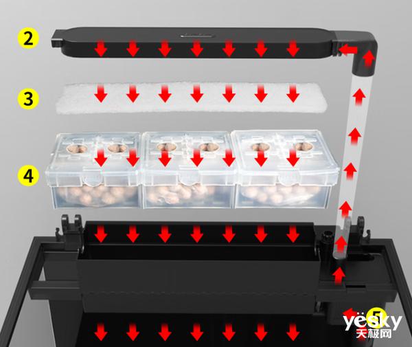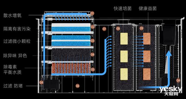在过滤方面,当贝鱼缸采用双泵双过滤设计时,第一套是干湿分区的滴水盒,内置过滤棉、麦饭石球等过滤材料,可以有效隔离污垢,平衡水质。第二套是生化过滤仓,分别是细菌培养和益菌模块。这部分会培养大量硝化菌等有益细菌,降低水中杂质,保证水质清澈稳定,过滤效果相当强。以上所有过滤模块都可以独立拆卸和更换过滤材料,甚至可以 DIY 放置自己喜欢的过滤材料,根据实际需要自由调整过滤装置。配合变频双泵,最大水流量达到 350L/H,过滤器增氧效果明显,运转时几乎没有噪音。