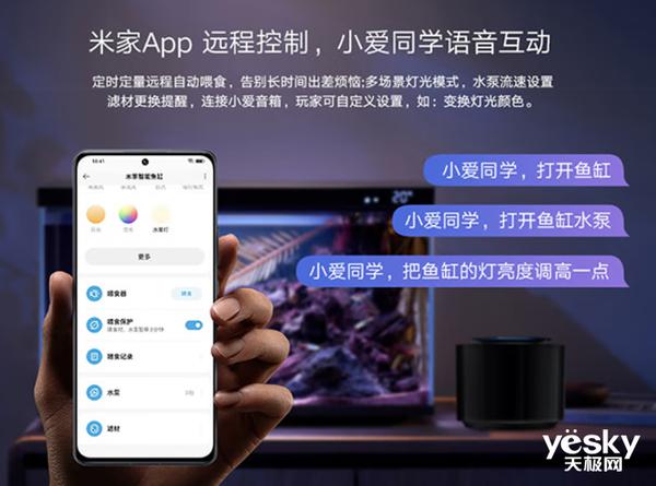 在性能方面,小米鱼缸支持自动喂食功能,选择创新的旋转式防卡粮搅拌仓,其容量为 30ml,加仓一次可以喂食。 90 天啊,不需要经常加鱼,比较适合忙碌的上班族。但是,喂食器可能会受潮。你可以把干燥剂放在喂食器里,自己改造。 ; 在鱼缸灯方面,配备了全色域生态灯,提供 5 选择各种照明风格,分别为白光、流光、夜灯、溪流风、南美风。另外,小米鱼缸也支持米家。 APP 远程操作,可以根据养鱼的数量和类型设置按时、按量、准确喂养,或者远程操作照明模式。对经常出差或者旅游的人非常友好,也可以和小爱的同学语音互动。语音命令控制使鱼缸管理更加灵活方便。