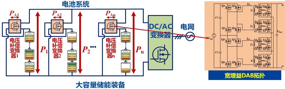 在大空间储能装备中,由于储能电池芯出厂时参数不完全一致,存在微小差异。当数百个电池芯直接串联形成电池组时,当多个电池组并联形成电池系统时,很容易导致每个电池组的内部状态不一致,最终导致并联电池组之间的电压差异,导致并联流动,经济性下降。传统的技术路线大多采用功耗约占设备额定输出功率1.5%的全功率变换器来抑制电池之间的电压差异,大大增加了系统的消耗、成本和体积。
