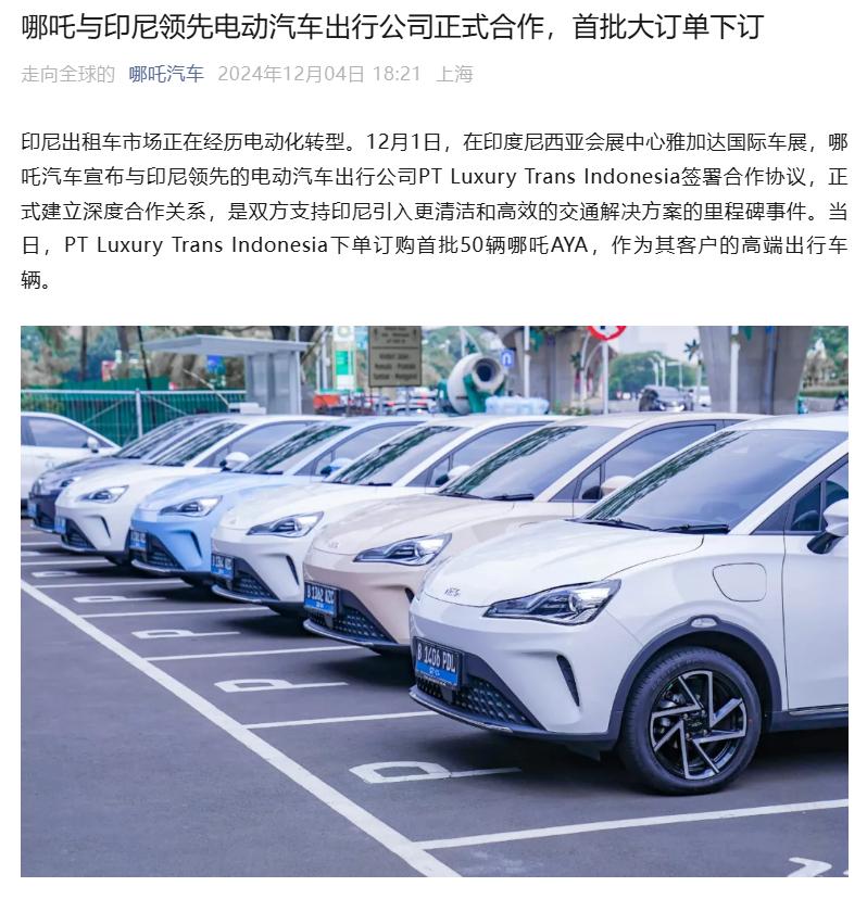 值得注意的是,哪吒汽车目前在海外市场仍然坚持高性价比的策略。最近,在雅加达国际车展上,哪吒宣布与印尼电动汽车旅行公司PT Luxury Trans Indonesia签署了合作协议,后者将首次购买50辆哪吒AYA作为客户的高端出行车辆。