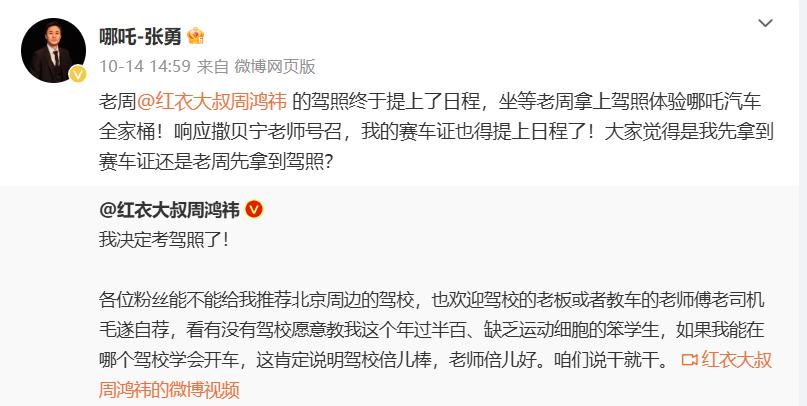 张勇最近的一条微博停留在10月14日。当时他还在和周鸿祎互动,周鸿祎是哪吒车的股东之一,说要考跑车证。