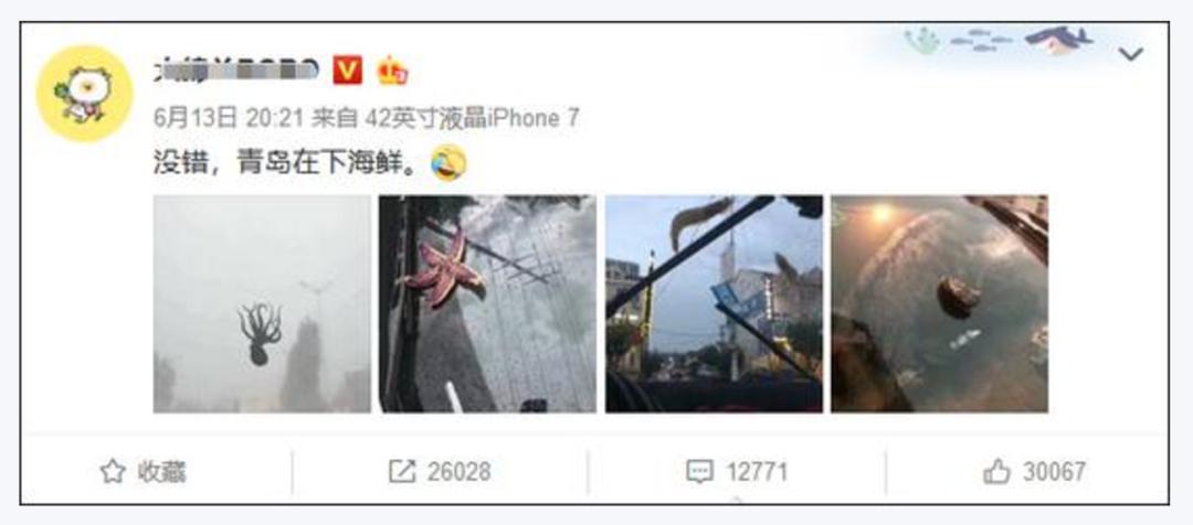 2018年,青岛也遭遇了神奇的“海鲜雨”。6月份当地天气不好,风浪(也许不是龙卷风)卷起了海洋中的生物,也可能吹过海鲜市场,导致海星、扇贝等生物从天而降。