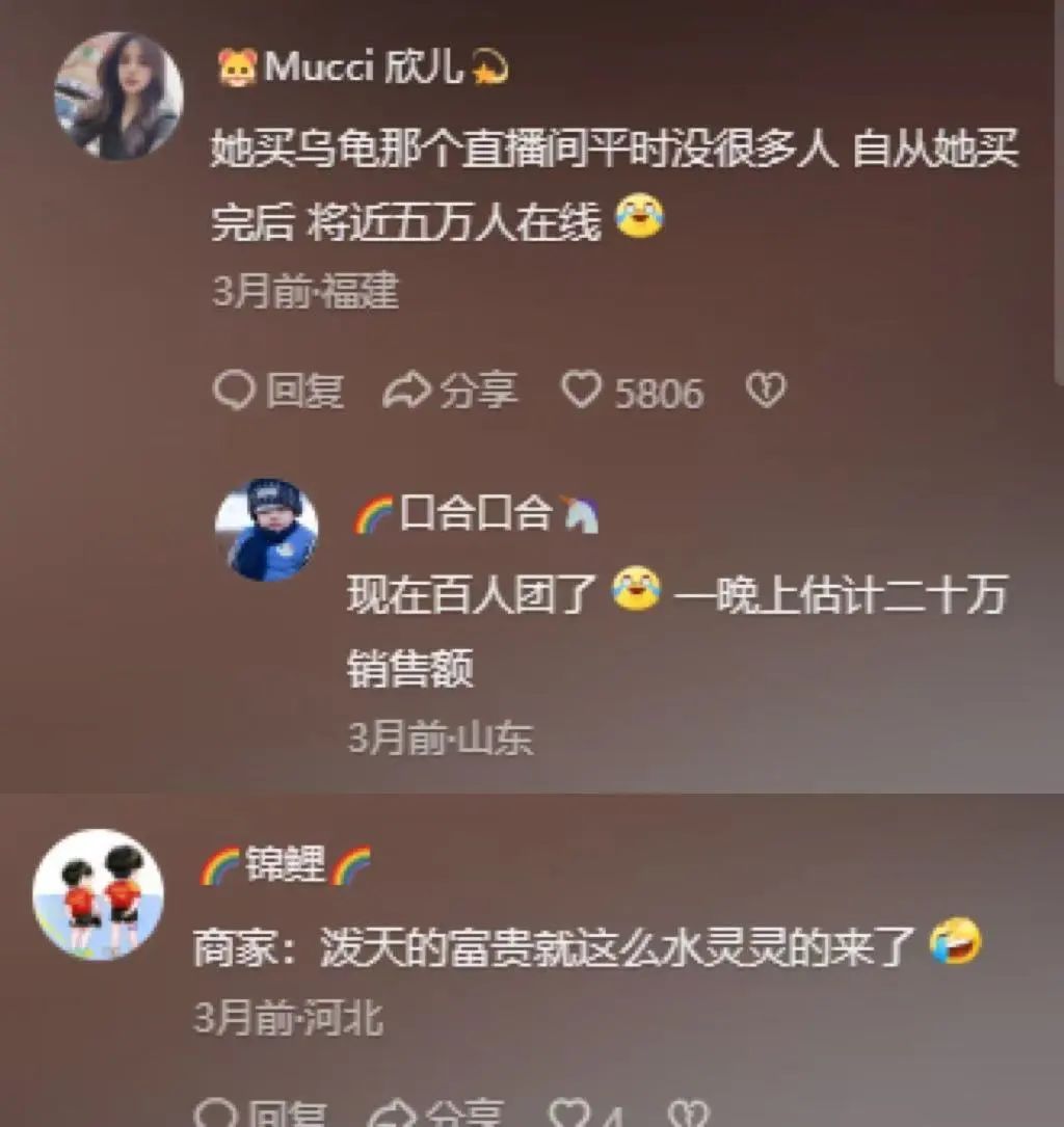 “ 一般情况下,她买乌龟的直播间人不多,自从她买了之后,接近5万人在线。 ”。