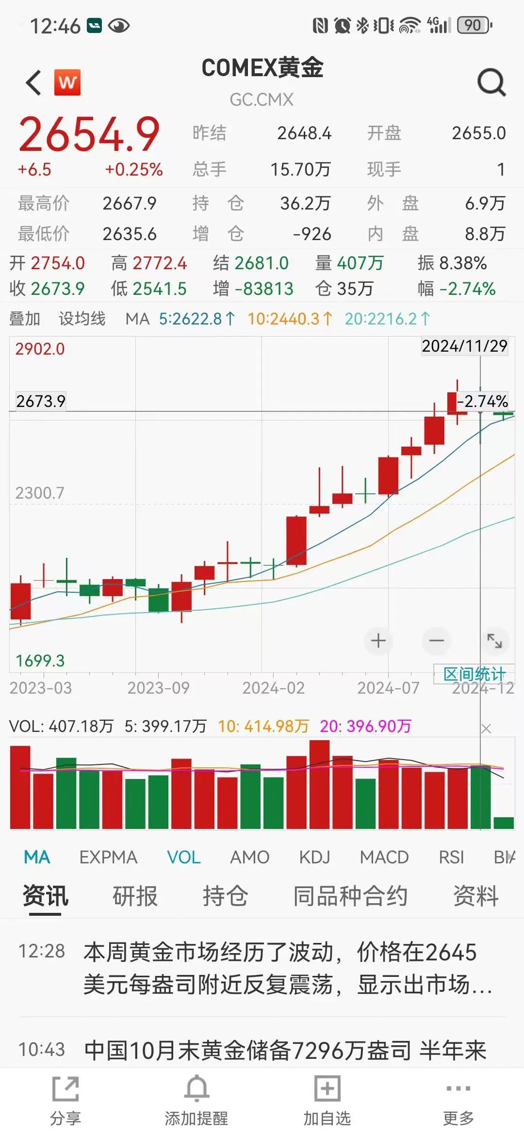 财联记者注意到,在特朗普获胜后,国际金价从历史新高一路下跌,但最近有所回升。COMEX黄金期货于12月7日凌晨报告2654.9美元/盎司,小幅上涨0.25%。