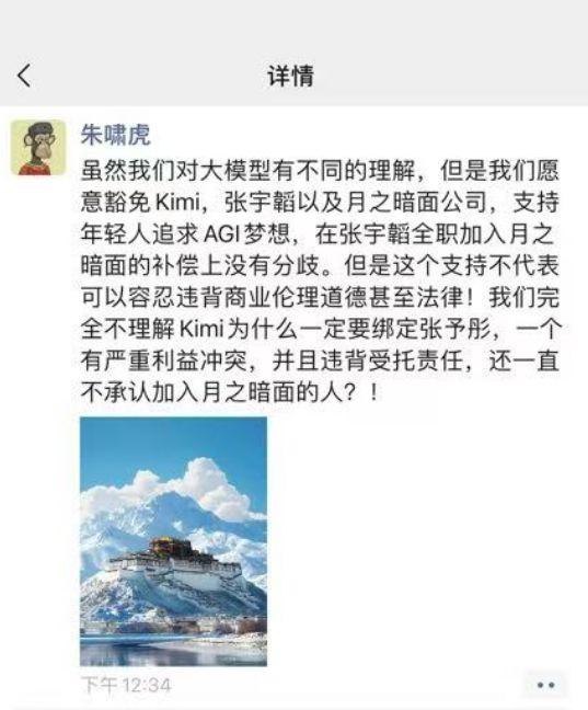 此前,朱啸虎曾在朋友圈里说:“虽然我们对大模型有不同的理解,但我们愿意免除kimi。、在张宇韬全职加入月之暗面的补偿中,张宇韬和月之暗面公司支持年轻人追求AGI理想,没有任何矛盾。但是这种支持并不意味着可以容忍商业社会的道德甚至法律!我们完全不明白为什么kimi必须绑定张予彤。一个利益冲突严重,违反委托责任,从未承认加入月亮黑暗面的人。”