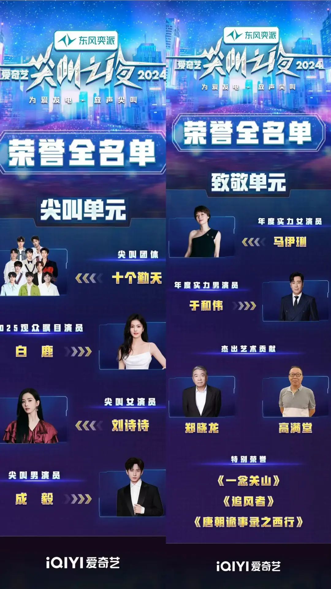 在2024年的尖叫之夜颁奖典礼上,成毅获得了“尖叫演员奖”,成为当晚最热门的人物和话题中心。由于成毅的支持者众多,现场被绿色灯海“硬控”了一整夜。当晚,“尖叫女神是iejj”这个词条也在微博热搜中排名第三。