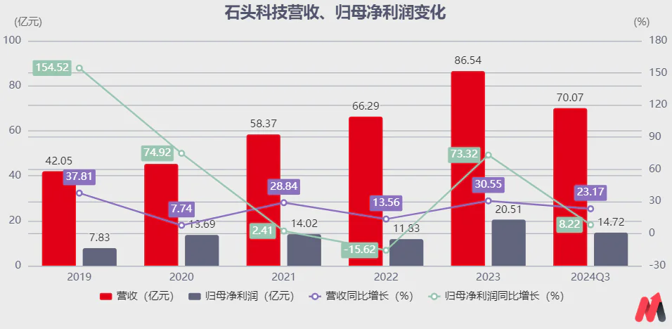 与此同时,2024年前三季度石头科技实现营收70.07亿元,同比增长23.17%;实现归母净利润为14.72亿元,同比增长8.22%。