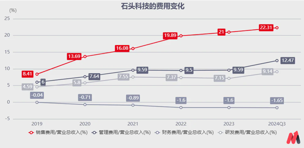 从石头科技历年的财务报告来看,我们发现重营销轻R&D的趋势。营销投资比R&D投资快。自2019年以来,石头科技的销售费用率逐年上升,公司的销售费用率从2019年的8.41%上升到2024年Q3的22.31%,增长近两倍。公司R&D费用率从2019年的4.59%上升到2024年Q3的9.14%。
