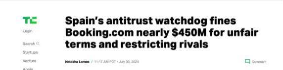 举例来说,今年七月,西班牙竞争监管机构(CNMC),对于全球OTA巨头Booking.com,给出历史上最“贵”的罚单(约4.13亿欧元),理由如下: