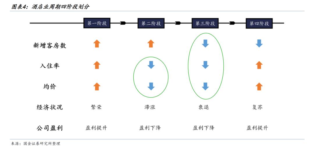 国金证券分析师根据历史发展规律,对酒店业周期进行了四个阶段的梳理,其发展轨迹主要有: