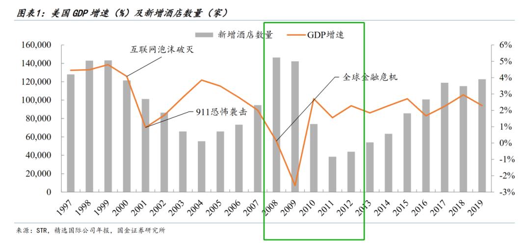 其中,2008年世界金融危机回放,美国酒店市场需求受到重创,随后酒店数量增长陷入低谷,直到2011年低点再次回升。