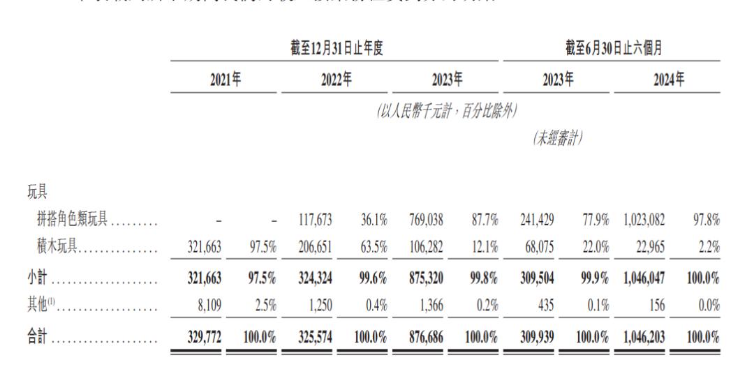 就收入构成而言,布鲁可的大部分收入来自于玩具销售,这项业务包括拼搭角色玩具和积木玩具。据悉,布鲁可于2022年1月开始推出拼搭角色玩具产品,招股书显示,2023年和2024年上半年,其大部分收入来自拼搭角色玩具产品的销售。2022年、2023年和2024年上半年,角色玩具产品销售收入分别为1.18亿元、7.69亿元和10.23亿元,占同期总收入的36.1%、87.7%和97.8%。