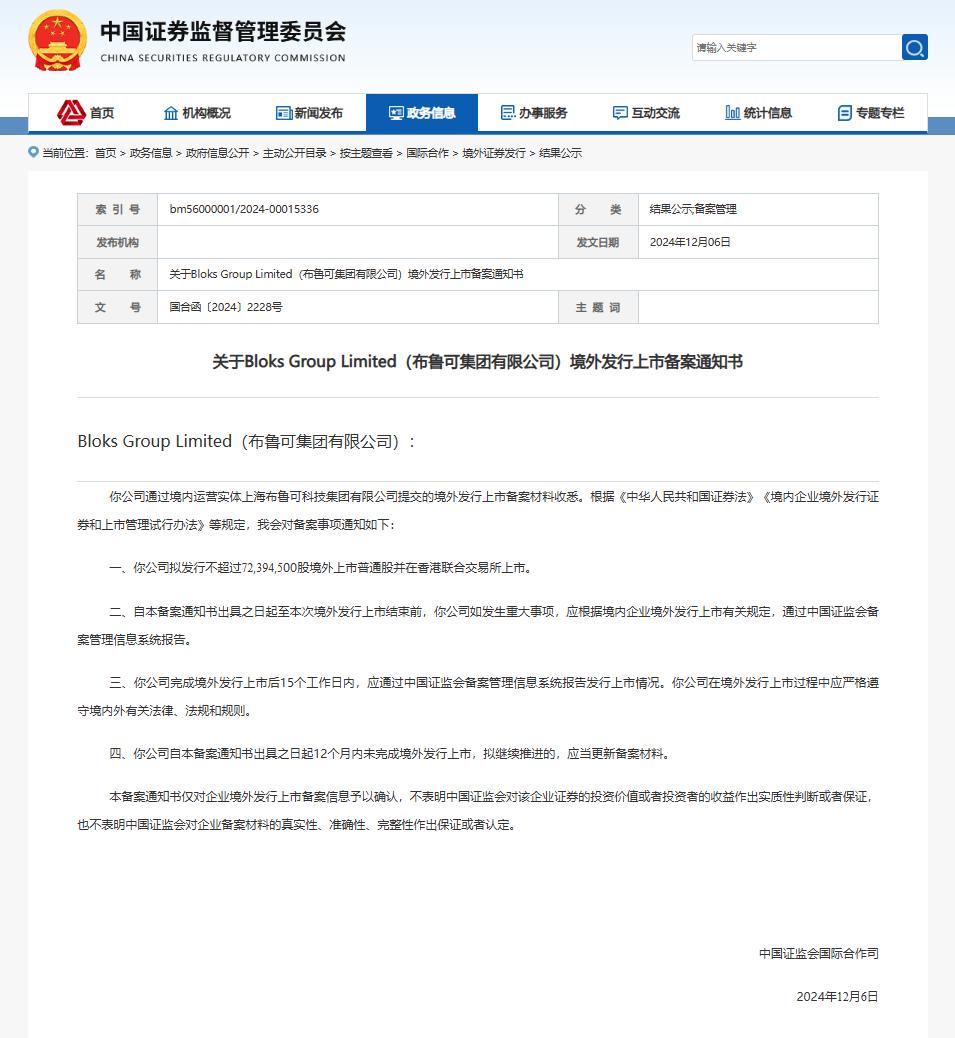 12月8日,积木玩具制造商布鲁可集团有限公司(以下简称“布鲁可”)再次向香港证券交易所提交招股书,其申请于2024年5月17日失效。此外,12月6日,布鲁可在香港的IPO已被中国证券监督管理委员会通知。