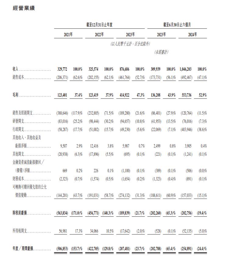 业绩方面,根据最新更新的招股书,2021年、2022年、2023年和2024年上半年,布鲁可的收入分别为3.30亿元、3.26亿元、8.77亿元和10.46亿元,毛利率分别为37.4%、37.9%、年亏损分别为5.07亿元、4.23亿元、2.07亿元和2.55亿元,47.3%和52.9%,净亏损分别为3.56亿元、2.25亿元、7288.2万元和2.92亿元。