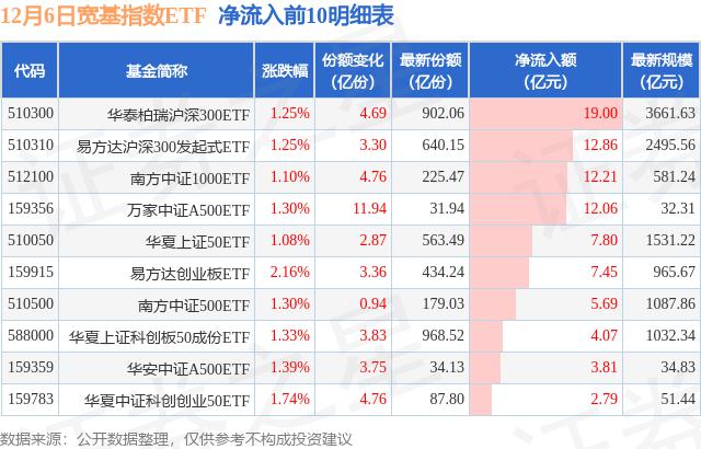 十二月六日,宽基指数ETF净流入96.61亿元
