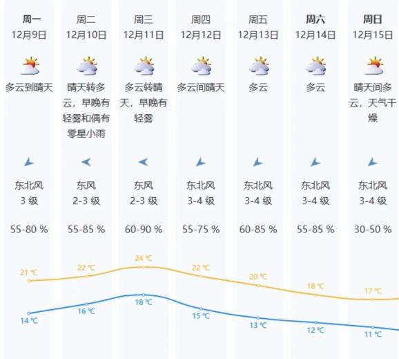 十二月九日,多云至晴天;气温14-21℃;东北风3级,相对湿度为55%-80%。