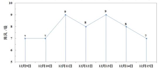 从星期三晚上到星期天早上,沿海海面和高山区持续8天。~9级北风,内陆平原阵风5级~7级,尤其是周三晚上和周五晚上,外海和沿海个别岛屿的风速最高可达10级。