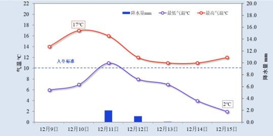 本周气温先升后降,预计周五是立冬。白天最高气温是15。~17℃,体验更舒适;周三至周日将有持续的降温过程,日平均气温下降幅度可达7~从星期五开始,9℃的最高温度只保持在9℃。~11℃;北部地区最低气温(周日上午)零下1~零下3℃,有冷冻;其他地区0~2℃,有霜降或薄冰。