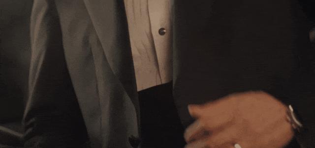 站定后整理西装前襟的手部特写,白色衬衫袖口露出手表,无名指戴着婚戒。↓
