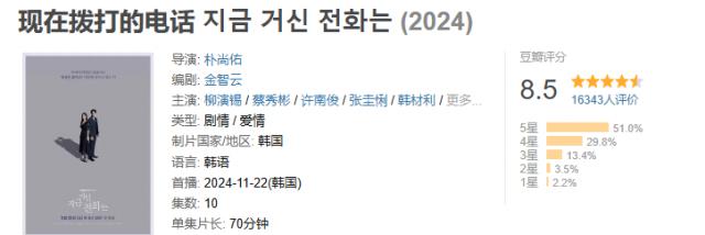 上线两周后,韩剧《现在拨打的电话》获得了全球非英语区第二名(11.25-15.01),也是30多个国家和地区的网飞榜冠军。