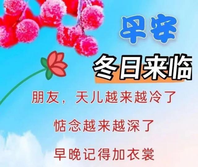 冬天已经很浓了,寒流已经到了;让苦恼冬眠,把烦恼藏在雪里!单纯的善良永远不会改变;尊重的朋友,关心他们;在寒冷的冬天,照顾好自己,照顾好自己,安全度过一个冬天!早上好!愿你的每一天都充满阳光,每一分都美好,每一秒都一切顺利!