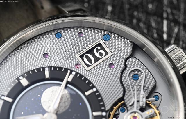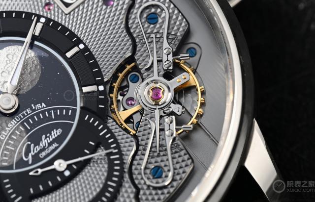这一次,格拉苏蒂首次将月相与机芯倒置结合在一起。我们可以看到,在偏心表盘中,有一个大月相。月球采用现实主义风格,可以在月球表面的环形山上看到。在月球下面,有一个砂金石板,模仿星空。在黑暗的镜子下,一个被遮挡的月球也若隐若现。眼见为实,当我拿到这块手表时,巨大的月相板大大提高了艺术效果,比普通的小月相窗好多了。