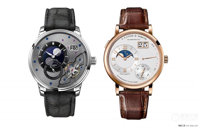 (左:格拉苏蒂原有偏心机芯倒置大日历月相手表;右:朗格1 大型月相手表)