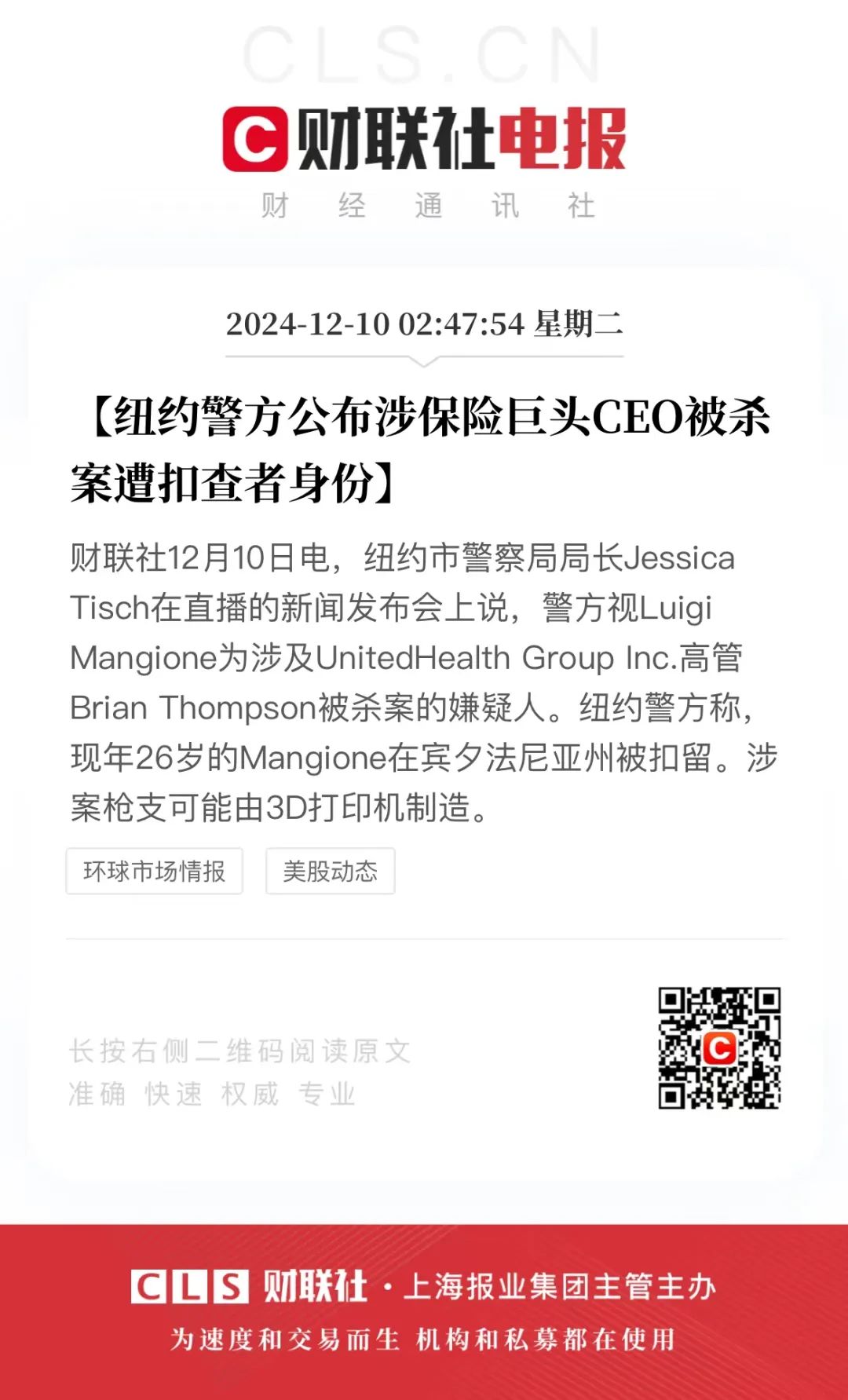 纽约警方宣布,相关保险巨头CEO被拘留。