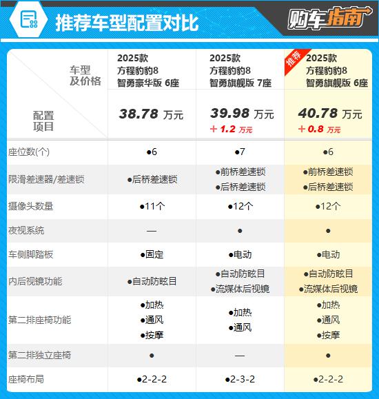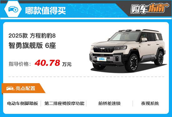 从综合配置和价格来看,个人更推荐参考价格。 40.78 万元的 2025 款方程豹豹 8 智勇旗舰版 6 座位,建议消费者在购买时可以优先选择。