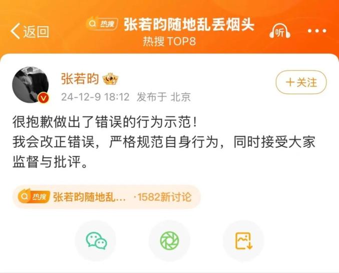 对此,12月9日,张若昀道歉说:“对不起,我做了一个错误的示范!我会纠正错误,严格规范自己的行为,同时接受大家的监督和指责。”