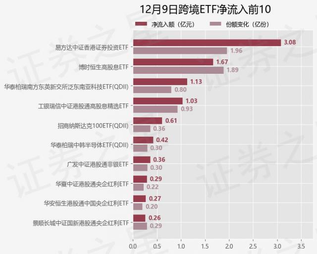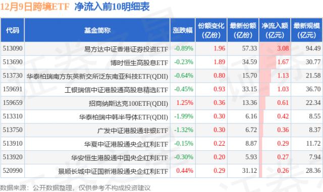 当天有 40 只跨境 ETF 资金净流入显示,其中易方达中证香港证券投资净流入排名第一。 ETF(513090),份额增加 1.96 十亿份,净流入额为 3.08 亿元。