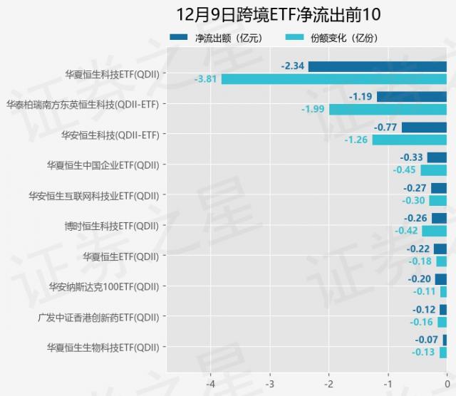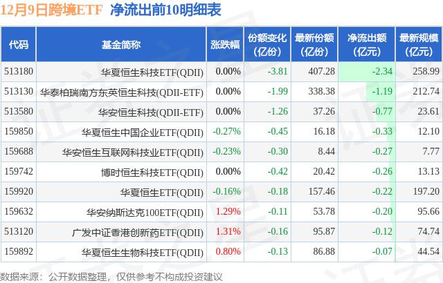 当天有 26 只跨境 ETF 资金净流出出现在基金中,其中华夏恒生科技排名第一。 ETF ( QDII ) (513180),份额下降 3.81 一亿份,净流出额为 2.34 亿元。