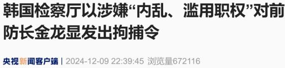 当地时间9日,韩国检察厅特别调查总部表示,前国防部长官金龙以“内战、滥用职权”为由,发出拘捕令。