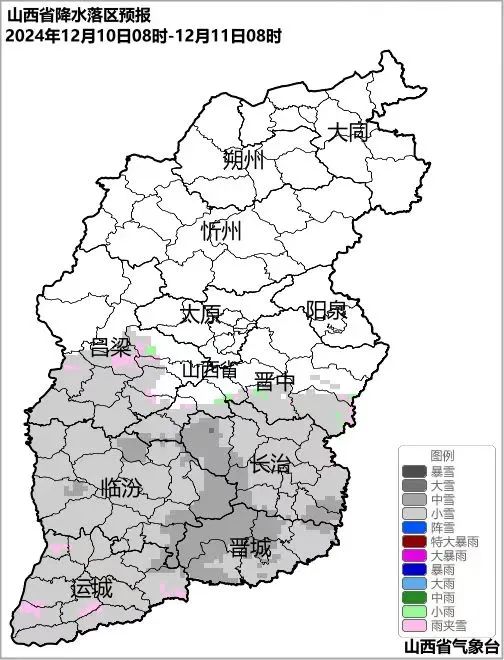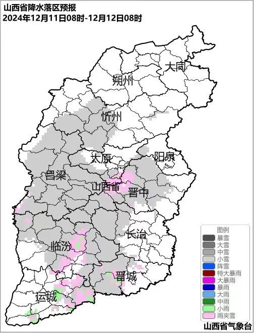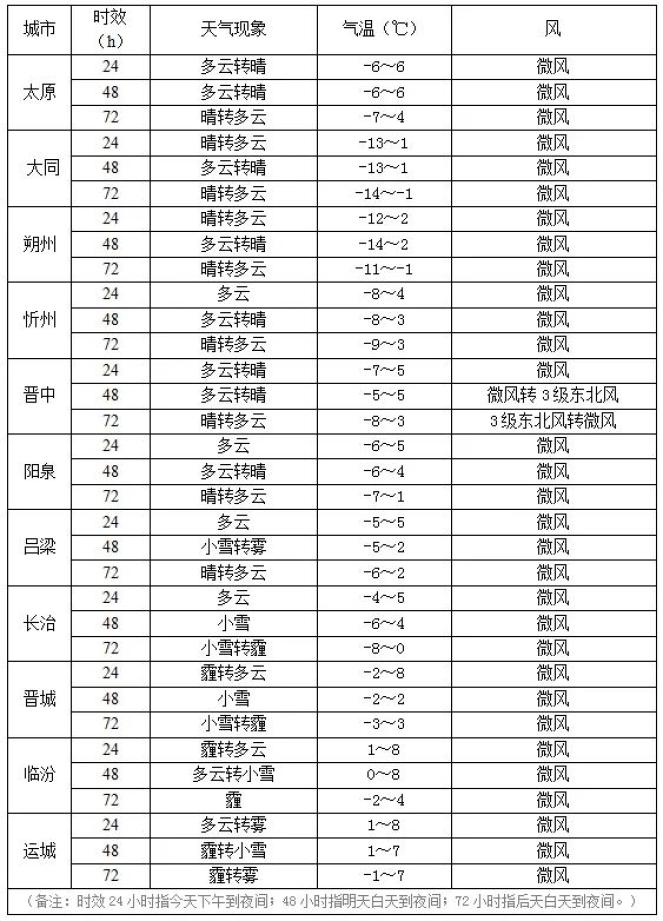 1.今天白天到晚上:北方阴天多云;中南阴天,部分地区有小雪或雨夹雪,临汾、长治、晋城等部分地区有中雪。
