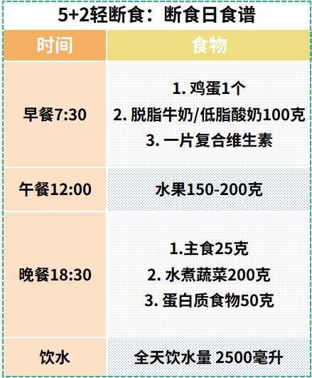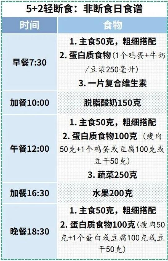 一周7天,其中5天正常进食,不连续2天少吃进行轻度禁食。请注意,这种轻度禁食并不意味着什么都不吃,而是限制了食物的摄入。微量营养素、碳水化合物、脂肪和蛋白质应按比例摄入四种营养素。