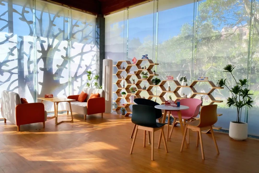 草地一侧的玻璃房是一个小微网格党群服务点——“兰心亭”。温暖的沙发桌椅,点缀着绿色植物,透过玻璃窗洒下的阳光...它为周围的人们提供了一个温暖的交流和服务空间。此外,公园还配备了篮球场等娱乐休闲场所,以满足不同年龄居民的体育需求。