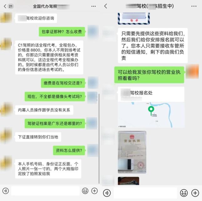 诈骗分子假冒驾校在网上宣传“驾照免试取证”业务,以“正规机构、系统可查、网上办理、免试、内幕操作、快速取证”等噱头吸引用户,诱导用户添加社交账号进行交流。在沟通过程中,使用虚假营业执照、虚假交警系统、虚假合同、虚假教练证等骗取信任。