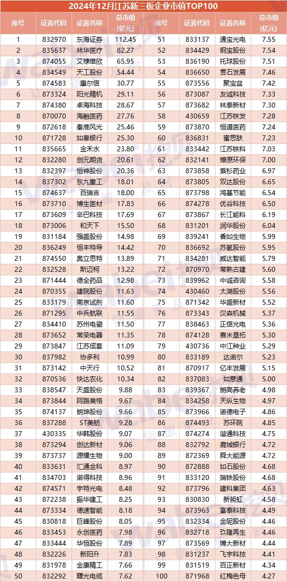 附-2024年12月江苏新三板企业市值TOP100(数据截至12月5日收盘)