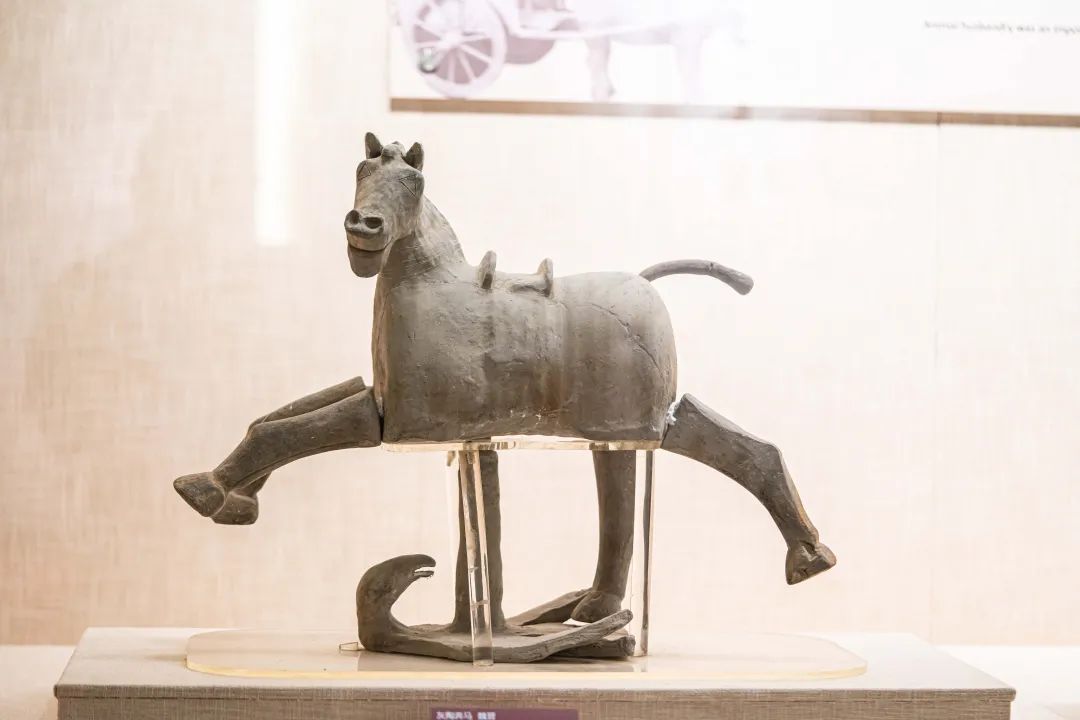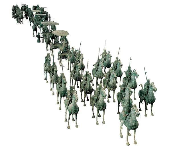 事实上,铜奔马是一个巨大的群体。“仪仗队” 其中一部分:这是原因 39匹铜马、1 头铜牛、1 辆斧车、4 辆轺车、3 辆辇车、3 辆“大车”、2 辆“小车”、1 辆牛车、17 一个手持戟矛的武士俑和 28 由奴婢俑组成。