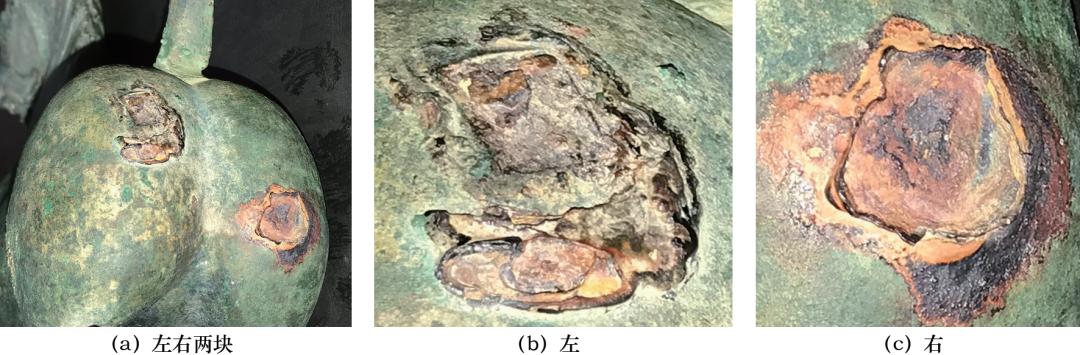 这样也证明了铜奔马选择的不是失蜡法,而是商周时期以来出现的。 黄铜陶范铸造法 ,也就是说,首先各自制作每一个零件,然后像积木一样将零件拼接在一起。 为避免“模具”和“范”在锻造过程中的位移,还会在其中垫上一些金属垫片。 马屁股上的两个圆形锈迹,就是放置铁垫的位置。
