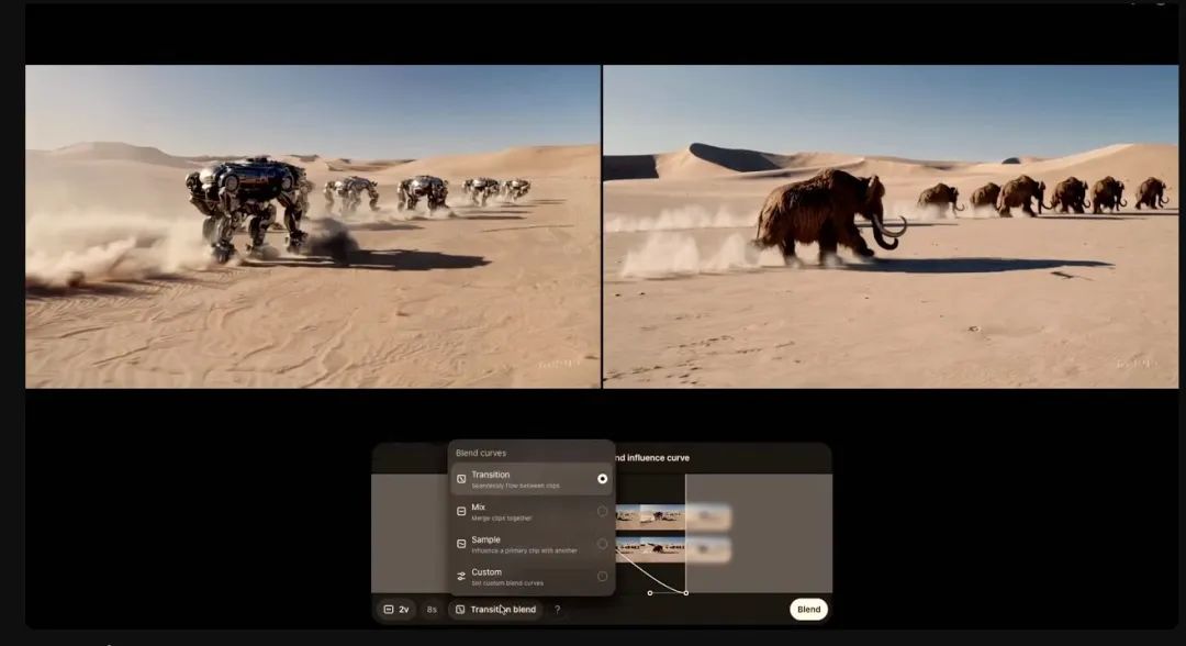 也就是说,你可以使用它。修剪和延长Recut修剪和延长(再剪辑)、再一次混合创造新的变化,混合视频之间的过渡。在现场演示中,猛犸象和机器人混合在一起,走在沙漠里。