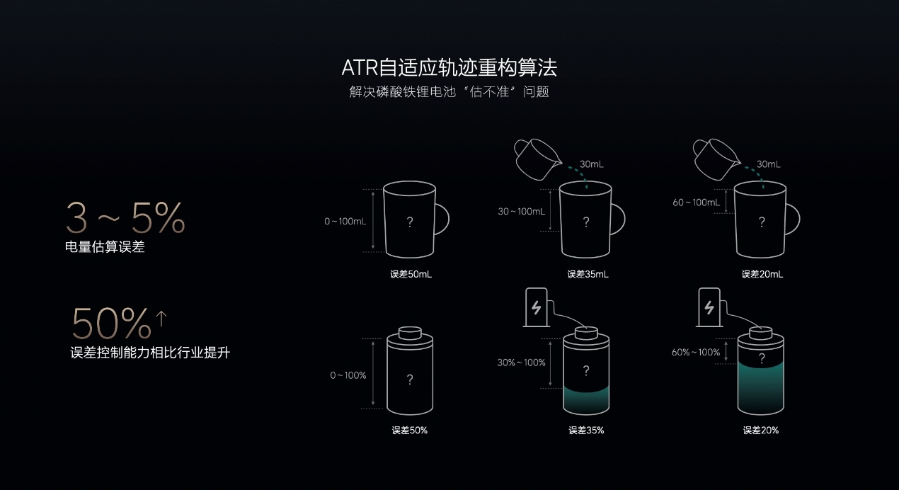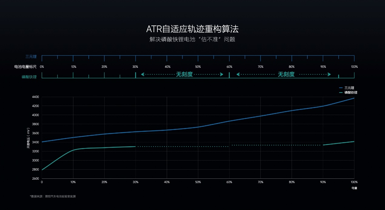准确估计电量是良好使用磷酸铁锂电池的前提。因此,理想表明其开发了ATR自适应轨迹重构算法,并率先应用于配备磷酸铁锂的理想L6车型。