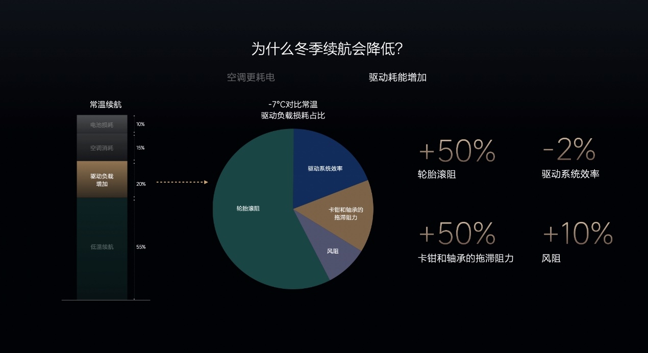 唐华寅除了消耗大空调的电量外,还强调,在低温环境下,轮胎等材料的物理特性的变化也会带来很大的行驶阻力,从而导致能耗的增加。例如,当零下7℃时,轮胎的滚动阻力将比常温下增加50%、车辆风阻增加10%。