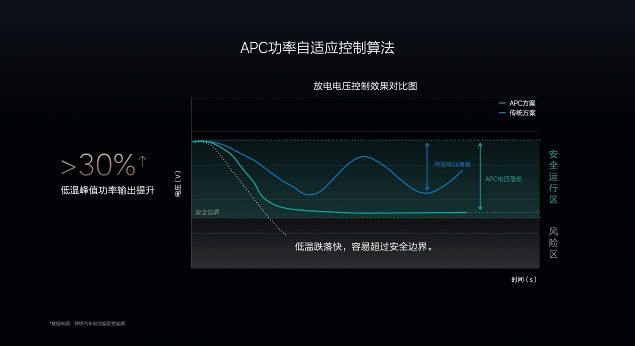 针对这个问题,理想推出了APC功率控制算法。通过高精度电池电压预测模型,可以在安全边界内最大限度地释放未来工况电池的动力。这使得理想L6在低温环境下的电池峰值功率增加了30%以上,增程器启动前的放电功率增加了12%以上。