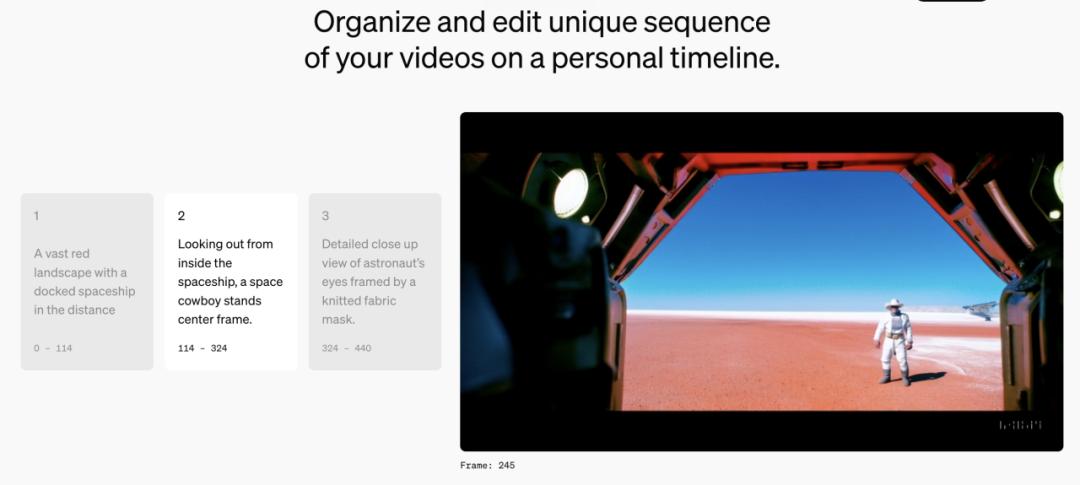 比如先写0-144帧的内容:“一艘太空飞船在广阔的红色背景下着陆”,然后写114-324帧的内容:“从太空飞船的角度看,一个星际牛仔站在画面中间”。最后,画面聚焦在一名宇航员的眼睛上,他正透过羊毛编织的面具向外看。