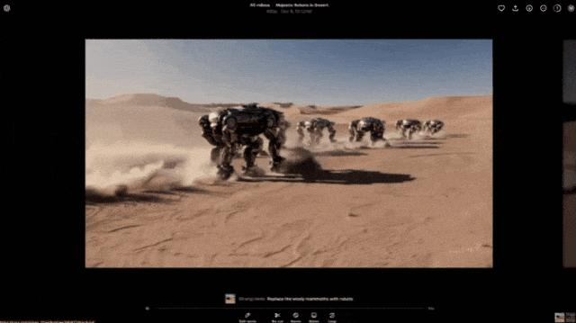 在直播间,OpenAI展示了如何用机械猛犸象代替走过沙漠的猛犸象,同时保留了最后一段视频中令人满意的沙漠和远处的沙漠。
